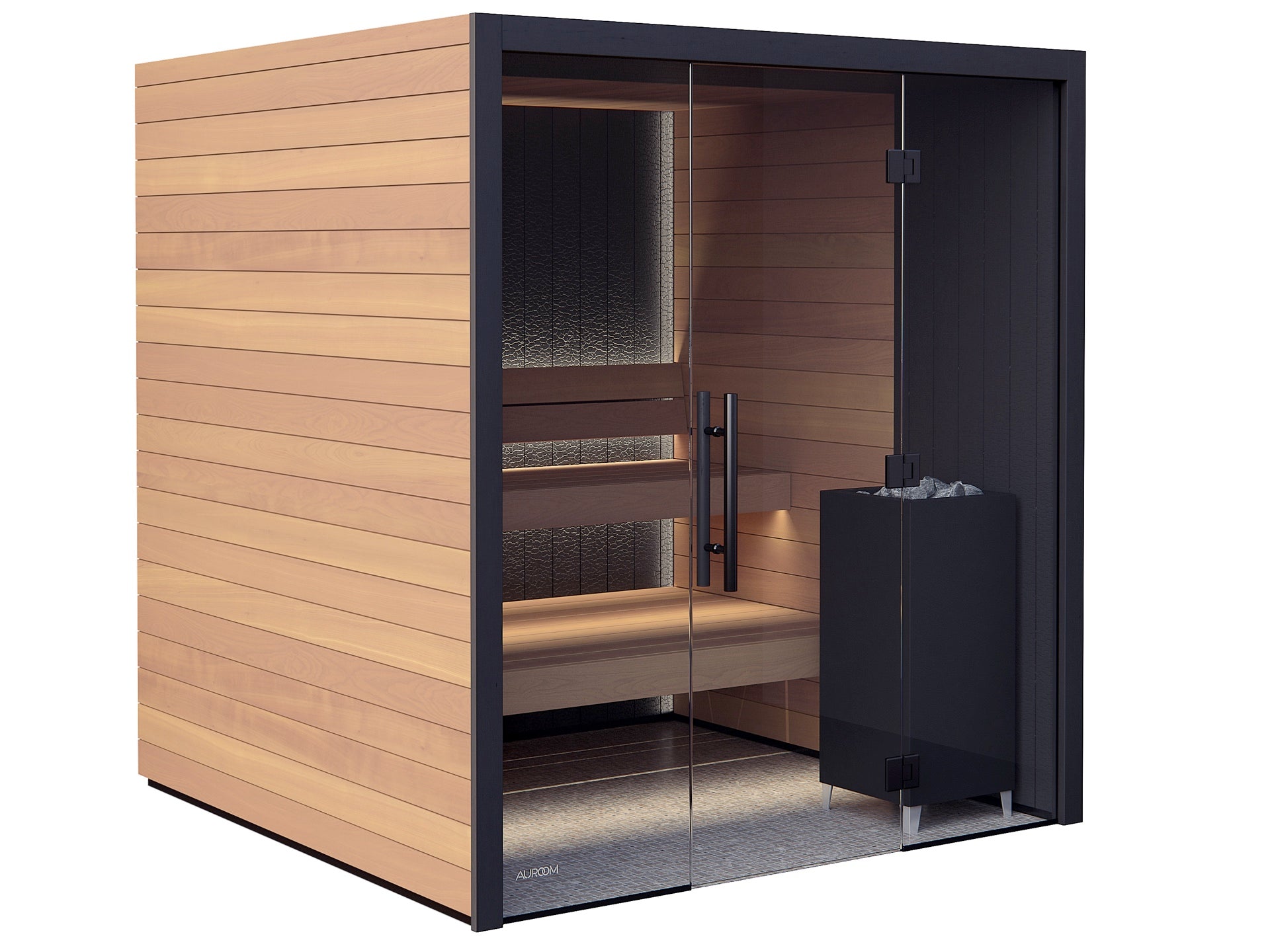 The Auroom Vulcana sauna features a sleek and contemporary design that combines thermo-aspen and ignite alder woods to create a visually striking interior. The thermo-aspen, a heat-treated variety of aspen, has a warm, golden hue and smooth texture that is complemented by the dark, embossed ignite alder accent wall.