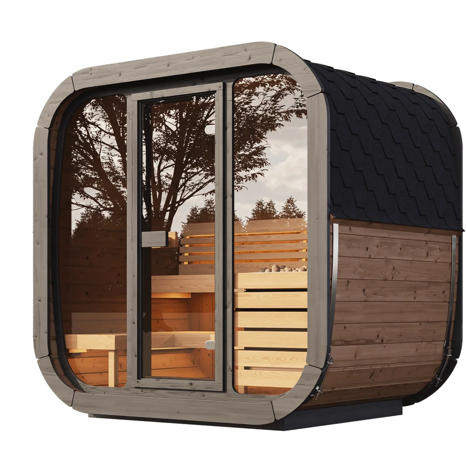 The Cube-Series Sauna combines unparalleled comfort, robust construction, and premium enhancements to create a backyard spa experience like no other. Designed with contoured seating surfaces and supportive arched backrests, it ensures lasting comfort, while the satin-smooth thermo-aspen seating remains cool to the touch for a relaxing sauna session. The bright, airy design, complemented by an expansive glass front wall, offers stunning outdoor views.